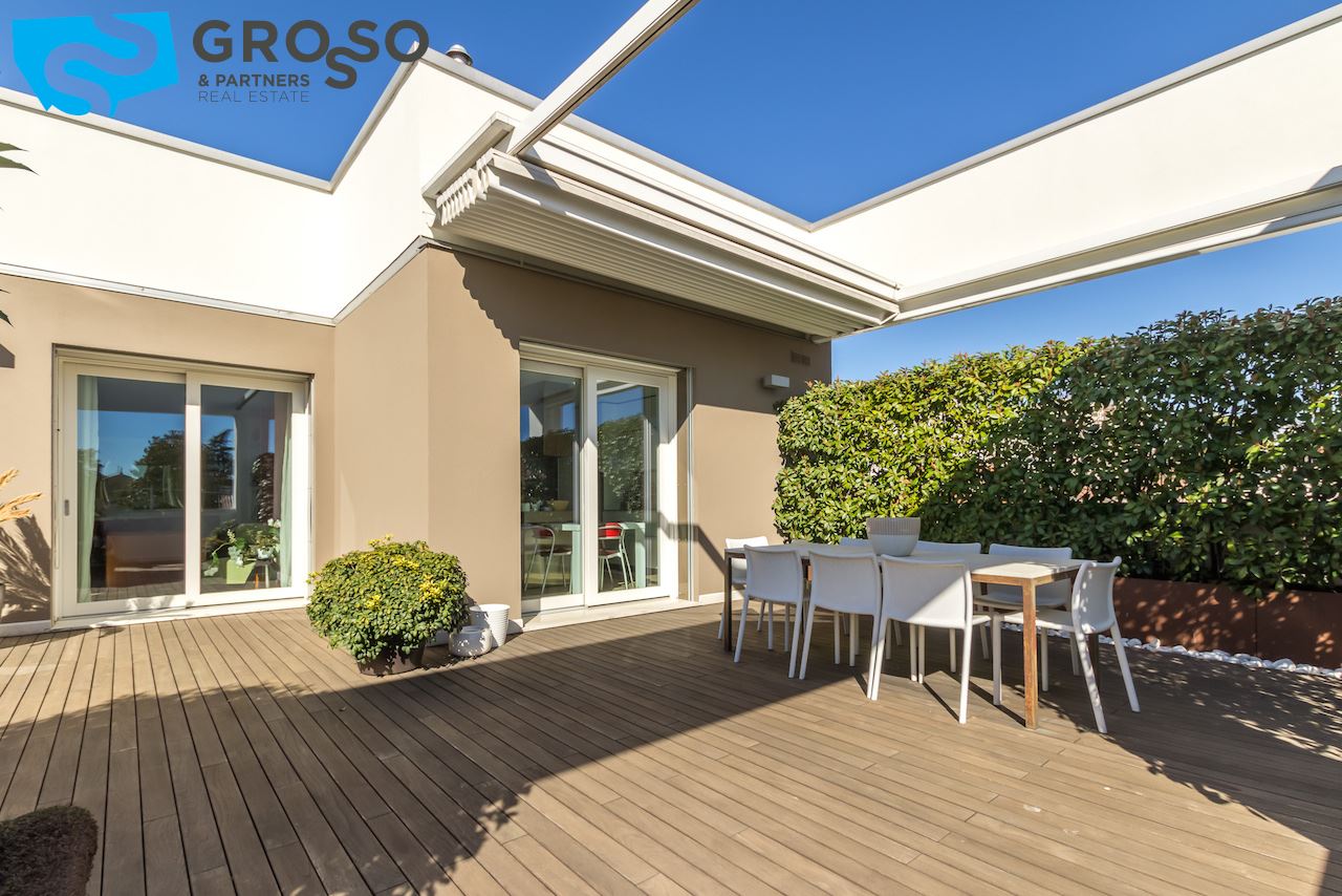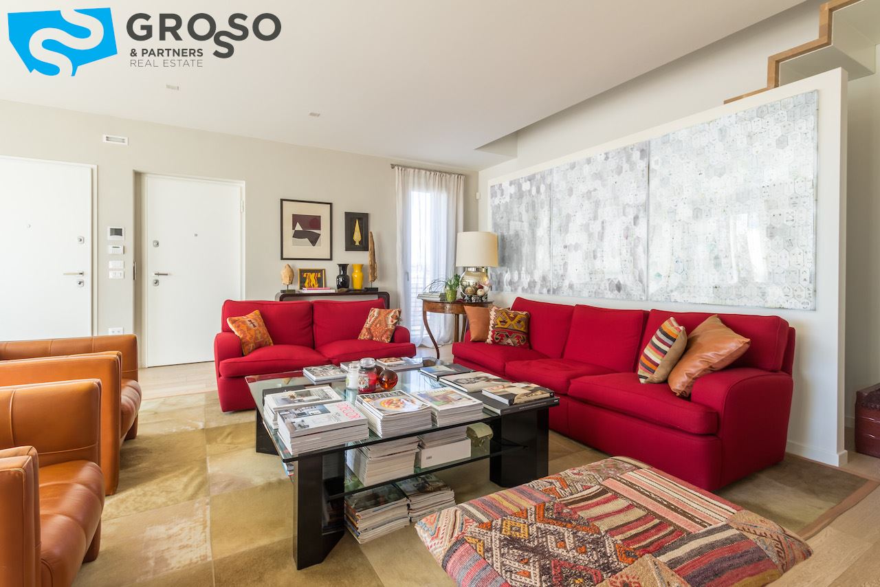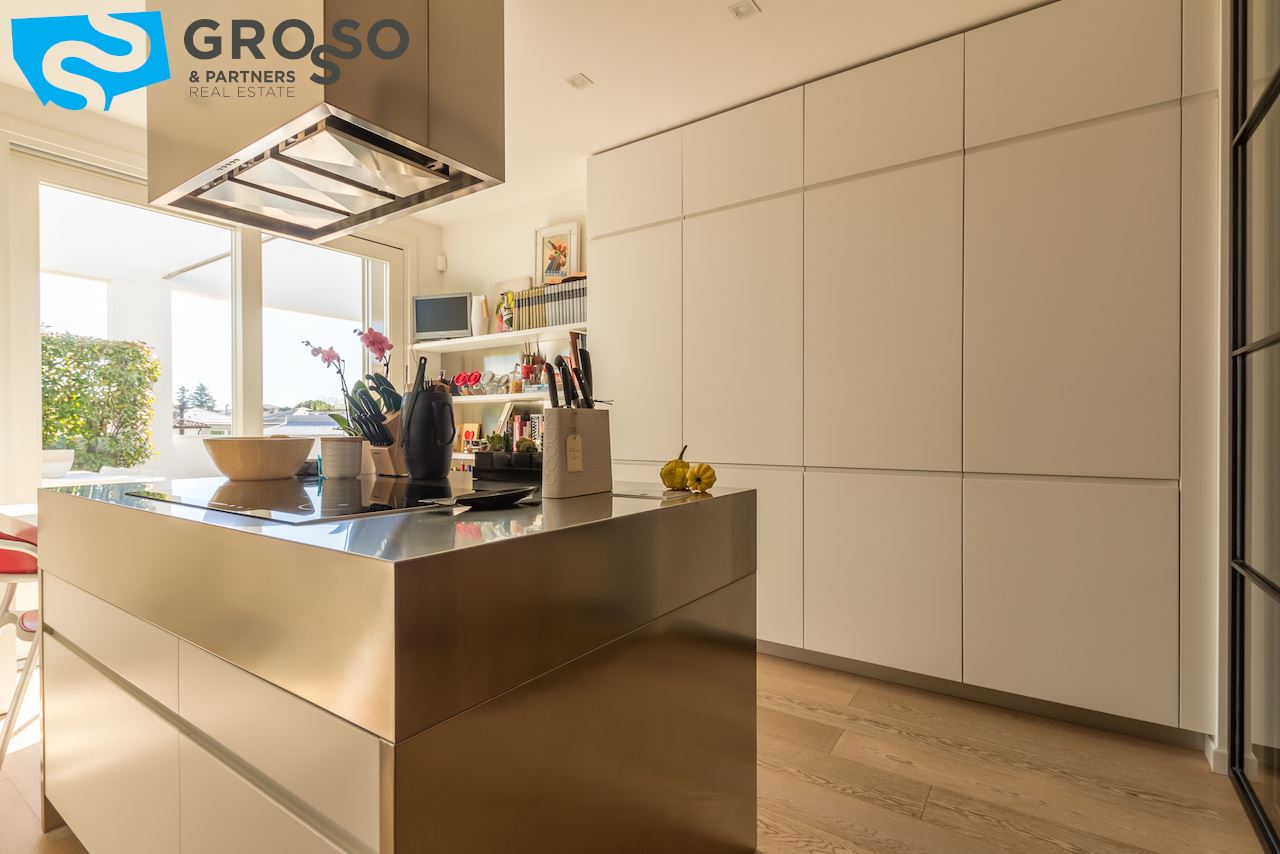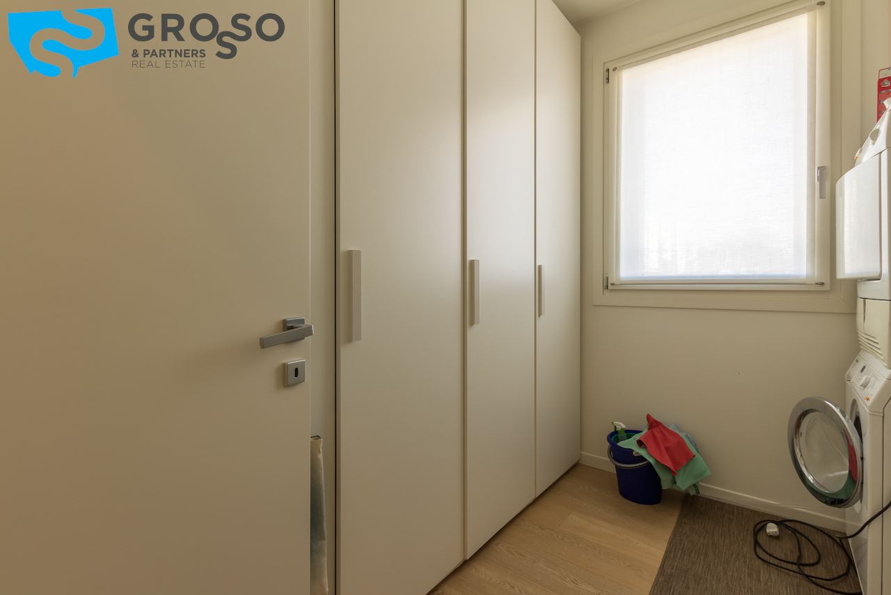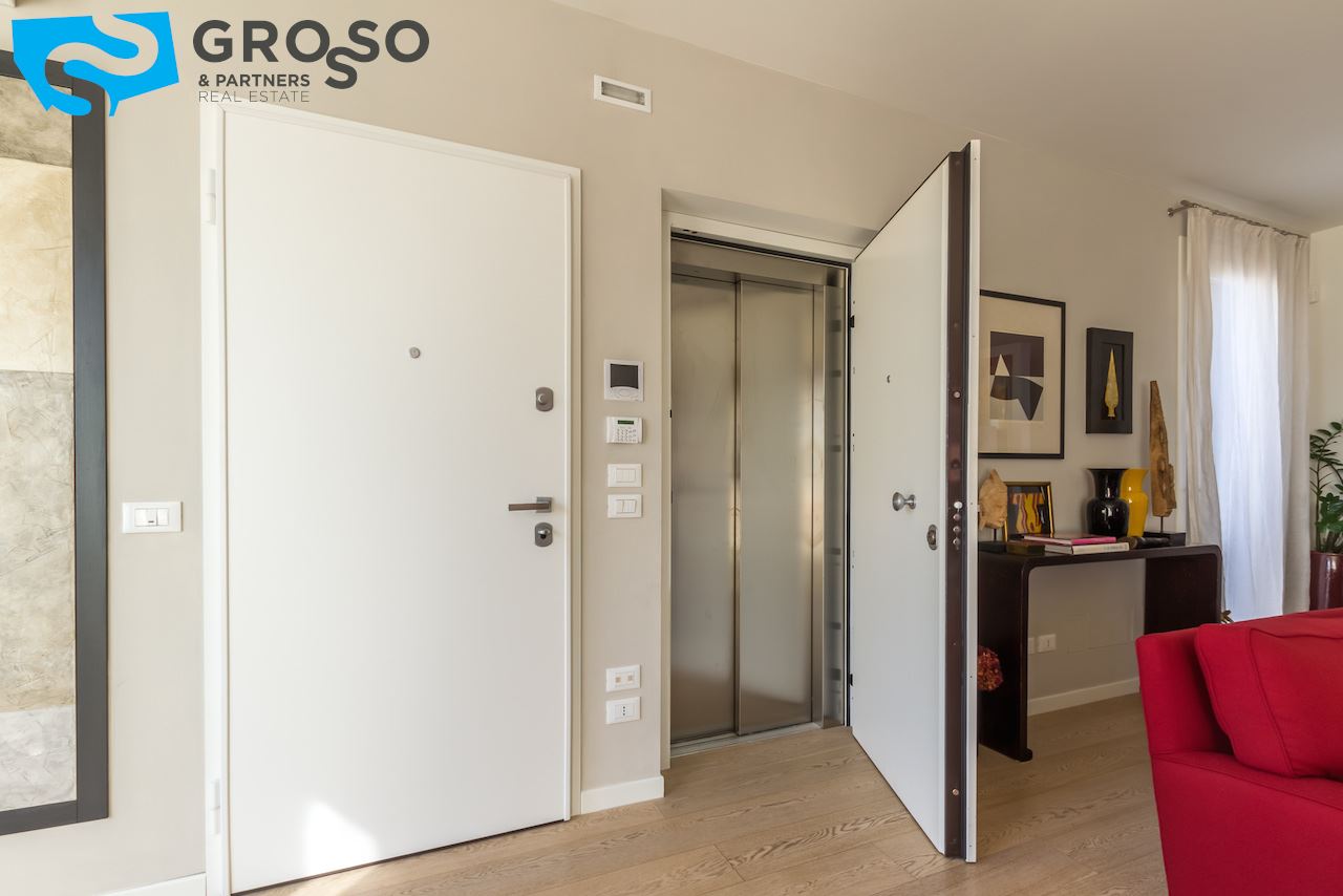 Ripostiglio nel sottoscala, impianto aria condizionata, impianto sistema allarme, magazzino al piano terra, garage doppio in larghezza, due posti auto esterni, riscaldamento a pavimento, giardino condominiale, ascensore in casa con porta blindata.