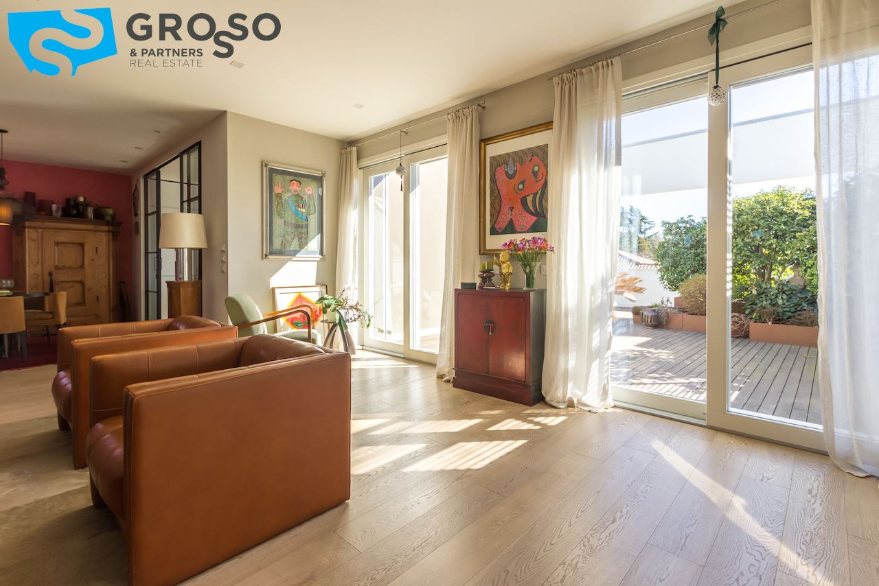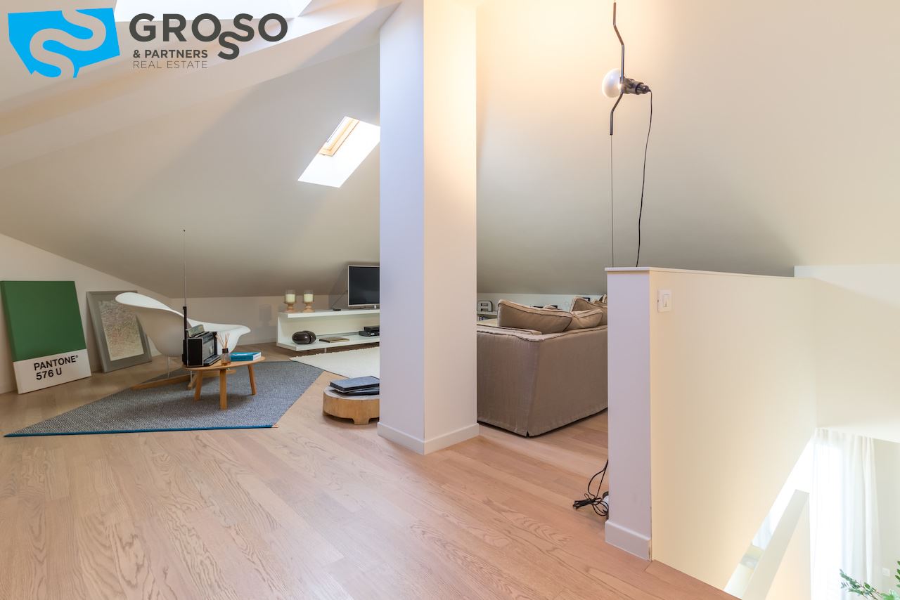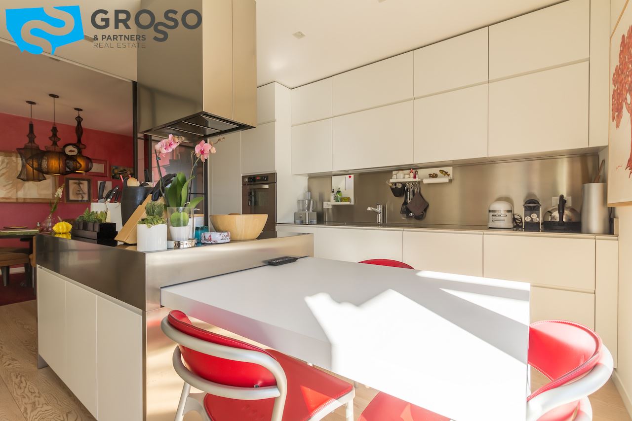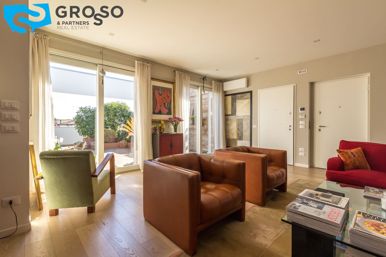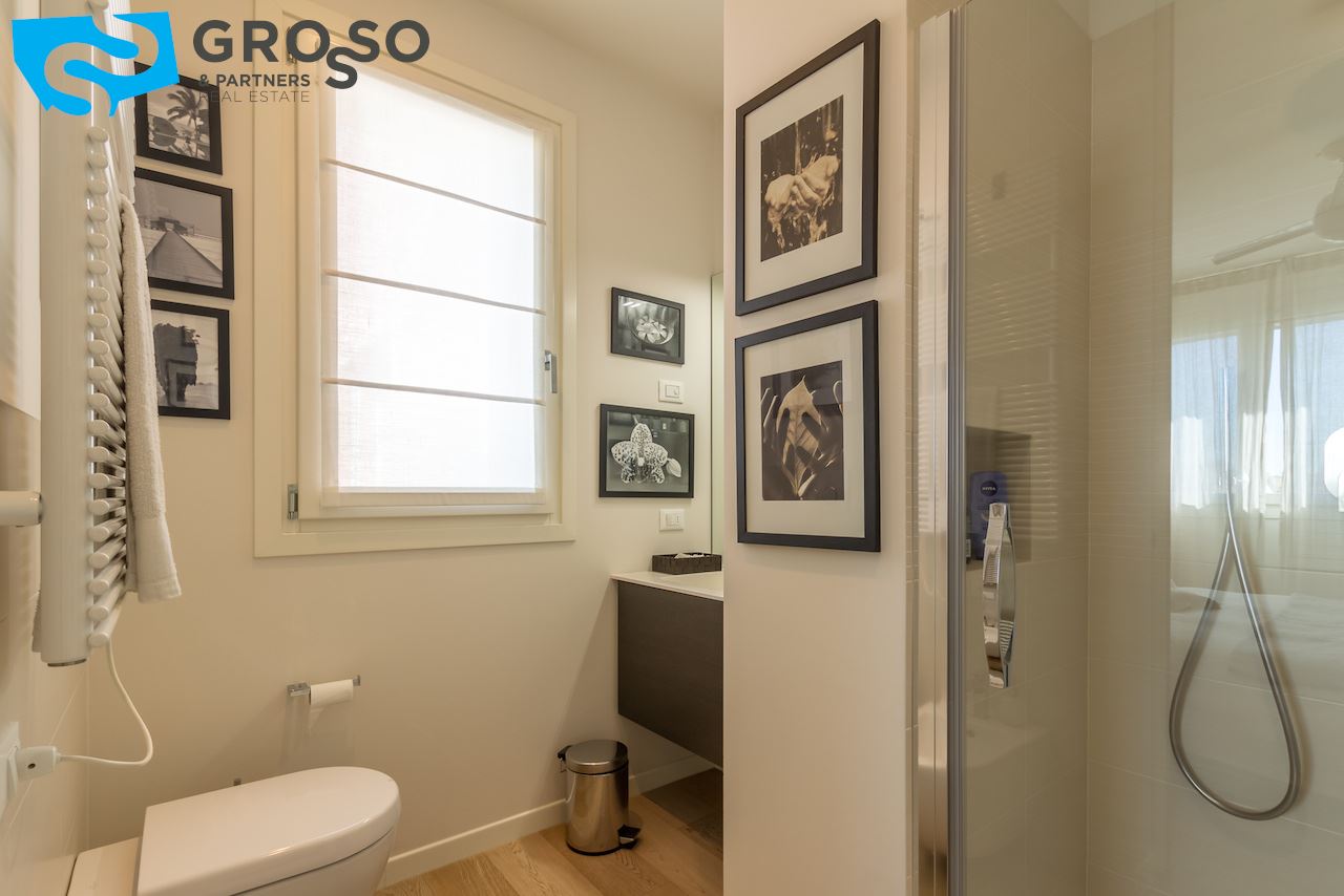Ripostiglio nel sottoscala, impianto aria condizionata, impianto sistema allarme, magazzino al piano terra, garage doppio in larghezza, due posti auto esterni, riscaldamento a pavimento, giardino condominiale, ascensore in casa con porta blindata.