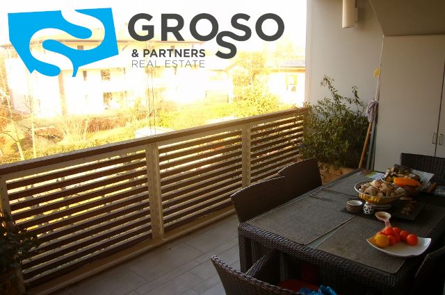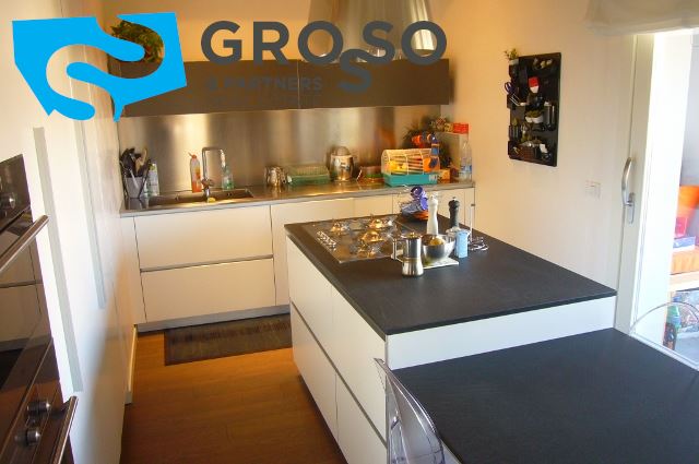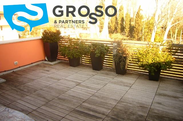 la cucina separata è modulabile con il salotto grazie alle ampie porte a vetro che valorizzano gli elementi d'arredo, direttamente collegata con la terrazza da oltre 26 mq.L'impianto di raffrescamento e riscaldamento è realizzato con sistema radiante a pavimento, presente il sistema d'allarme in tutta l'abitazione.