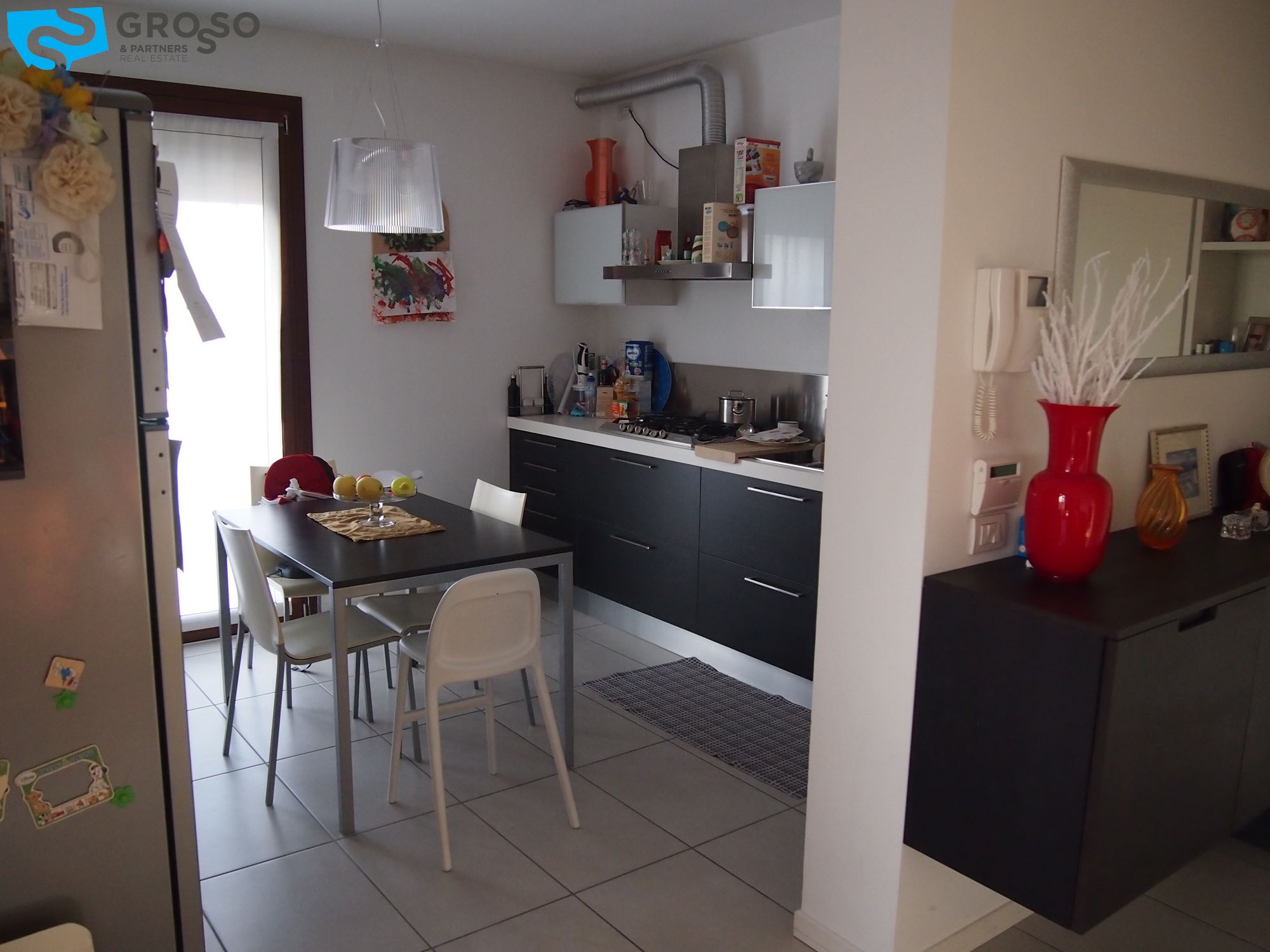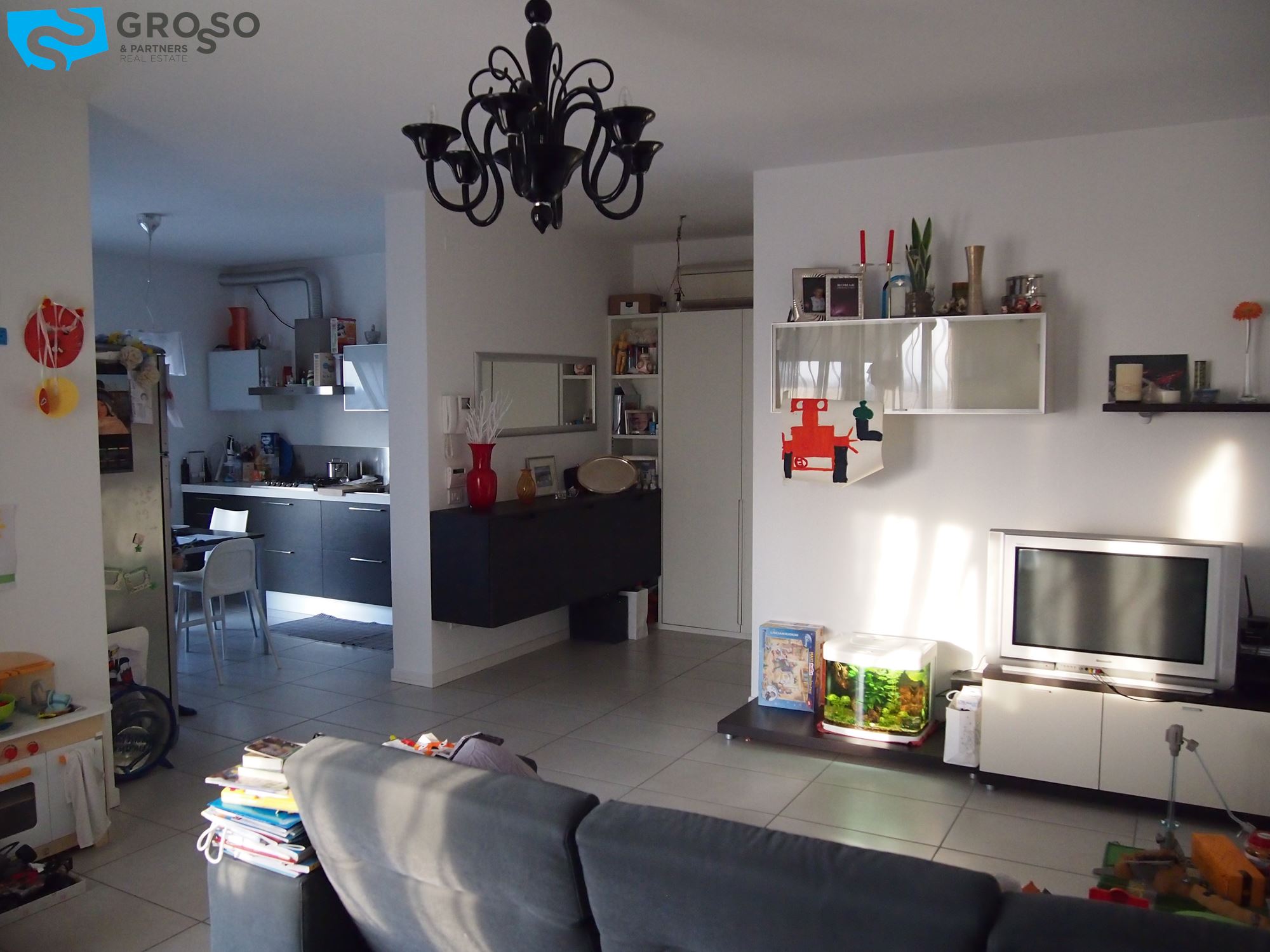 L'appartamento è cosi disposto: ampia zona giorno con cucina separata, due camere (matrimoniale e singola), doppi servizi, terrazzo vivibile, garage singolo e cantina.