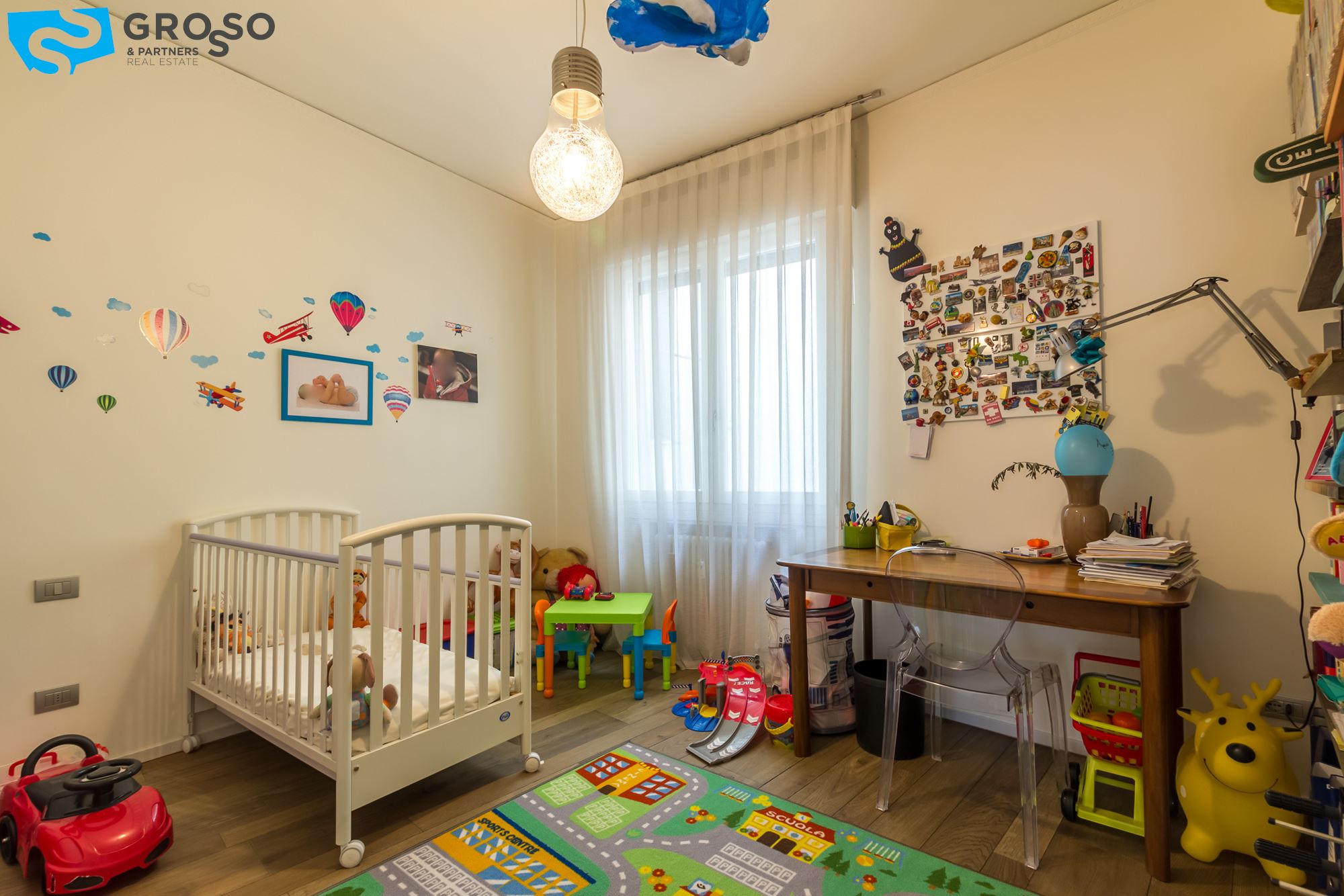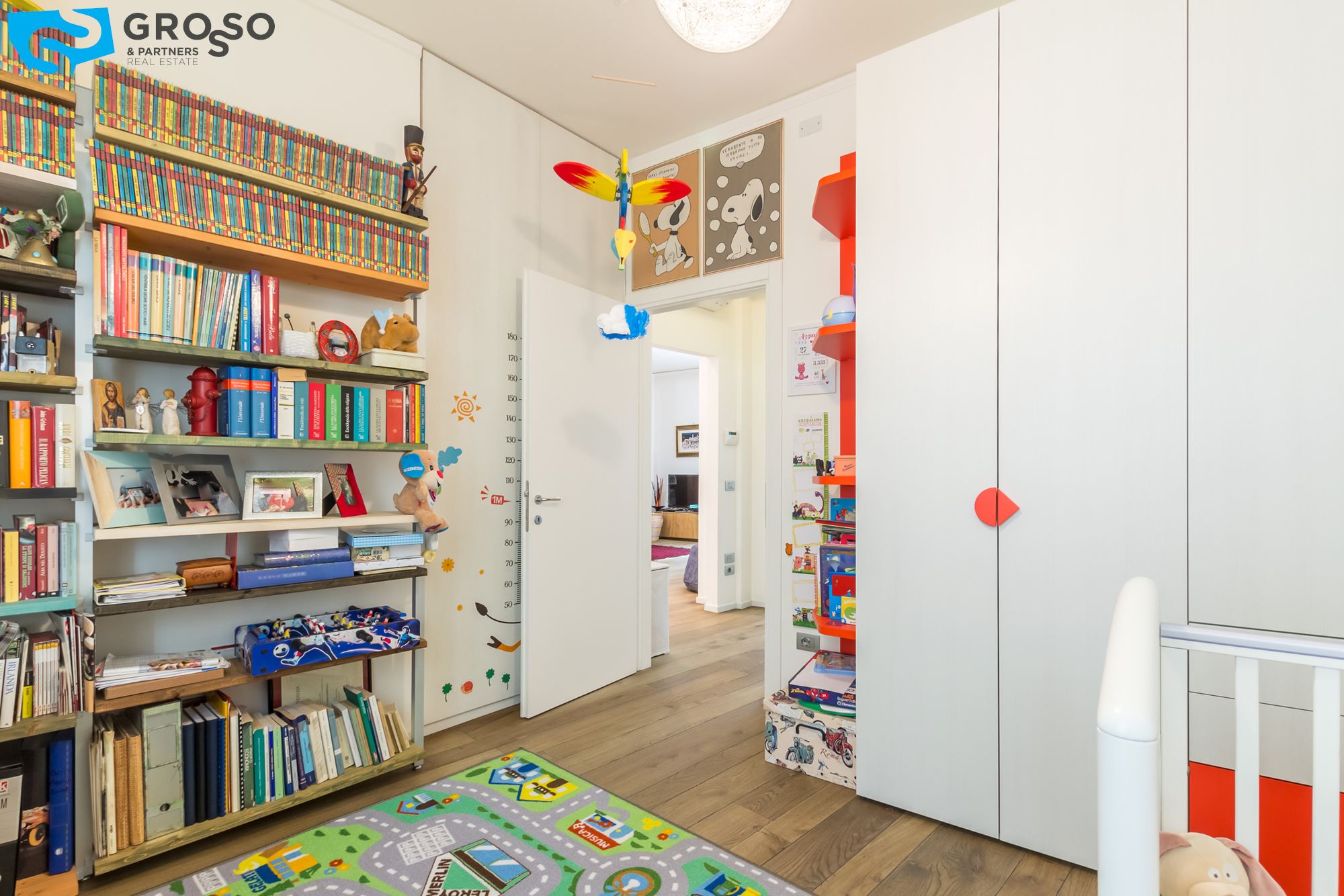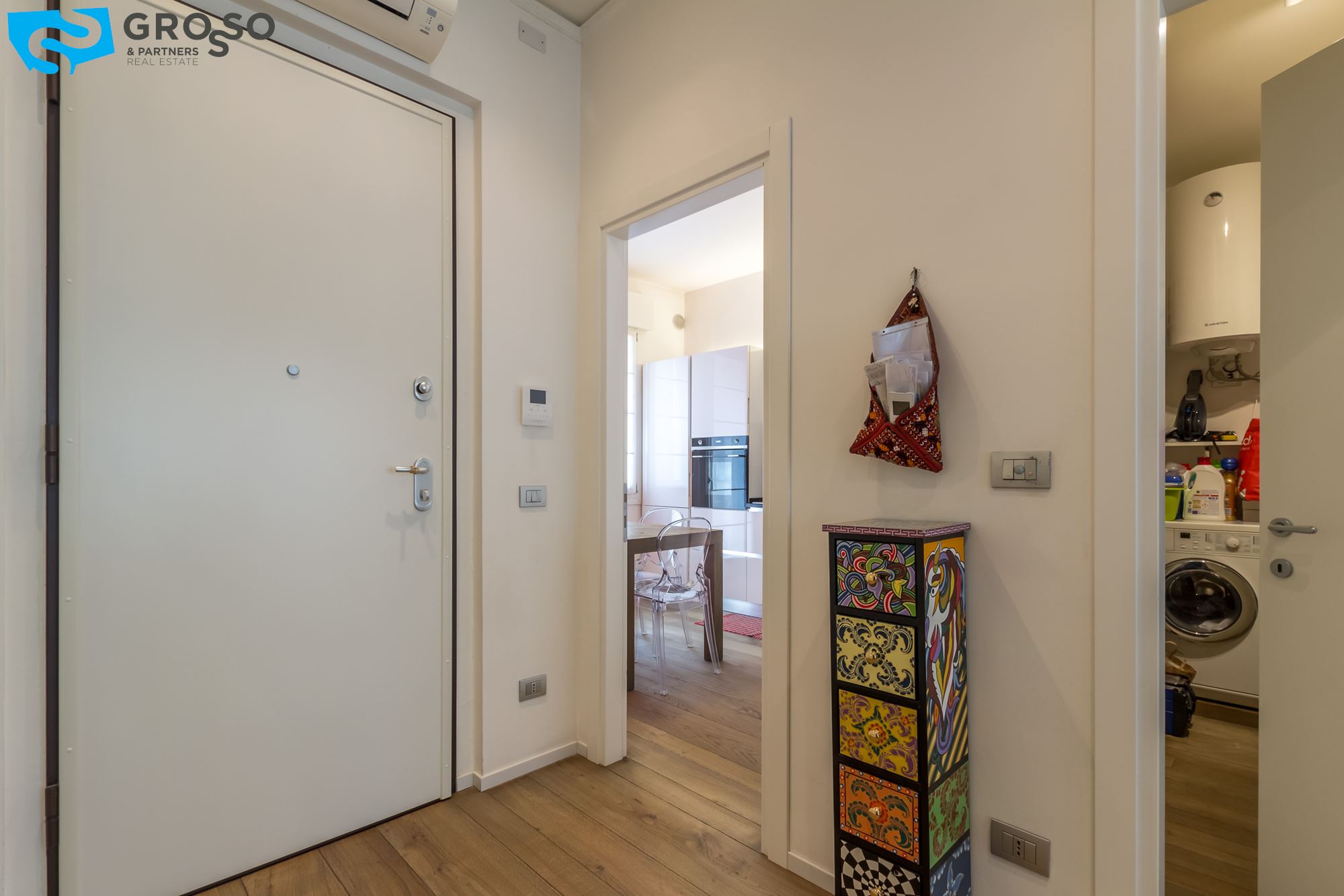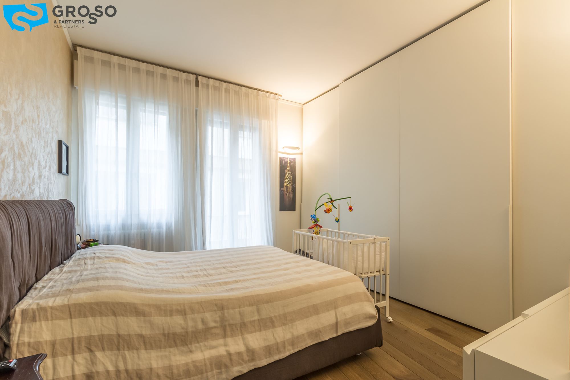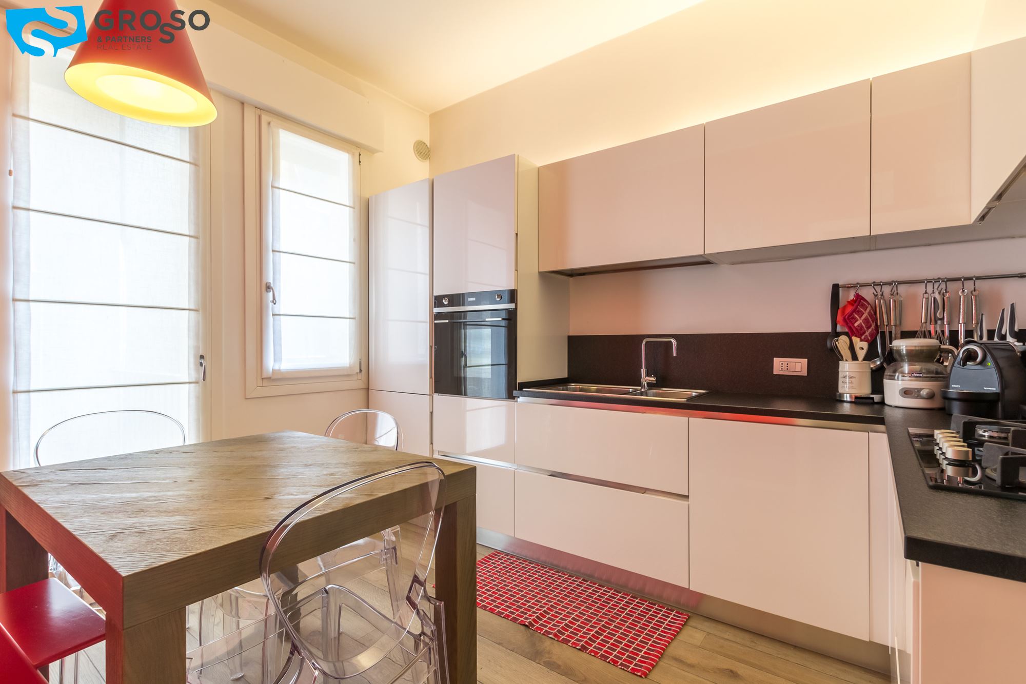 L'appartamento è composto da cucina abitabile, salotto, comodo ripostiglio-lavanderia, bagno finestrato, due ampie camere matrimoniali; soffitti di quasi 3mt.