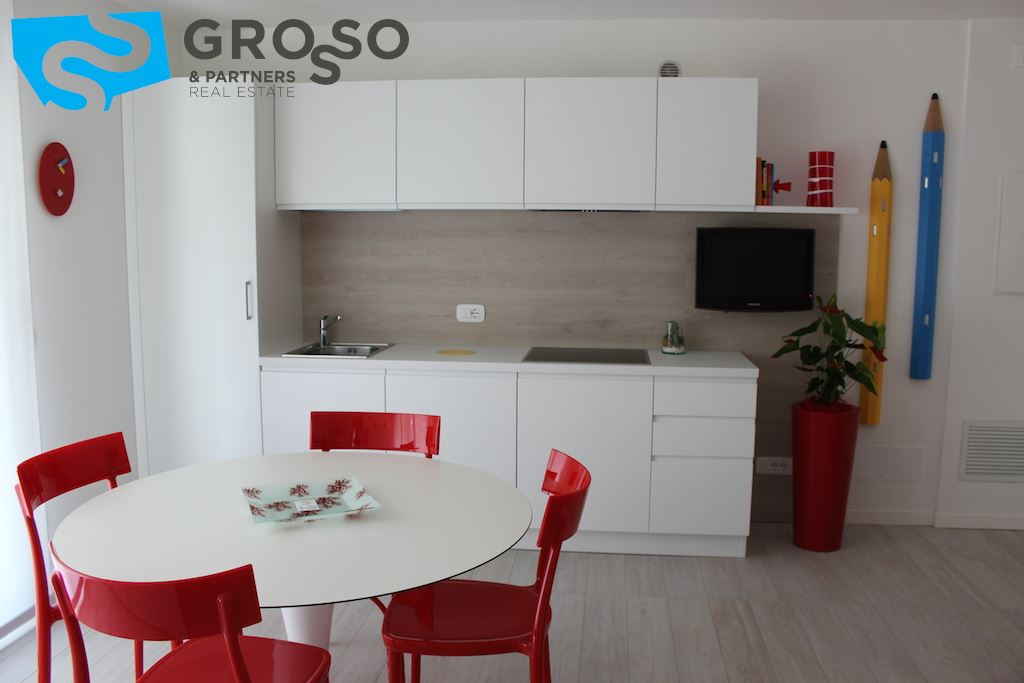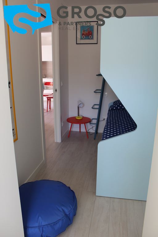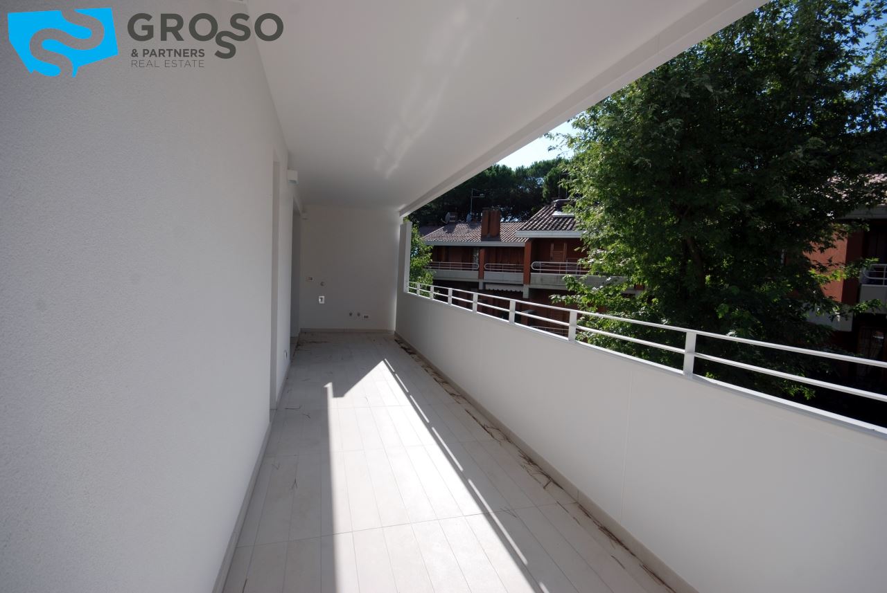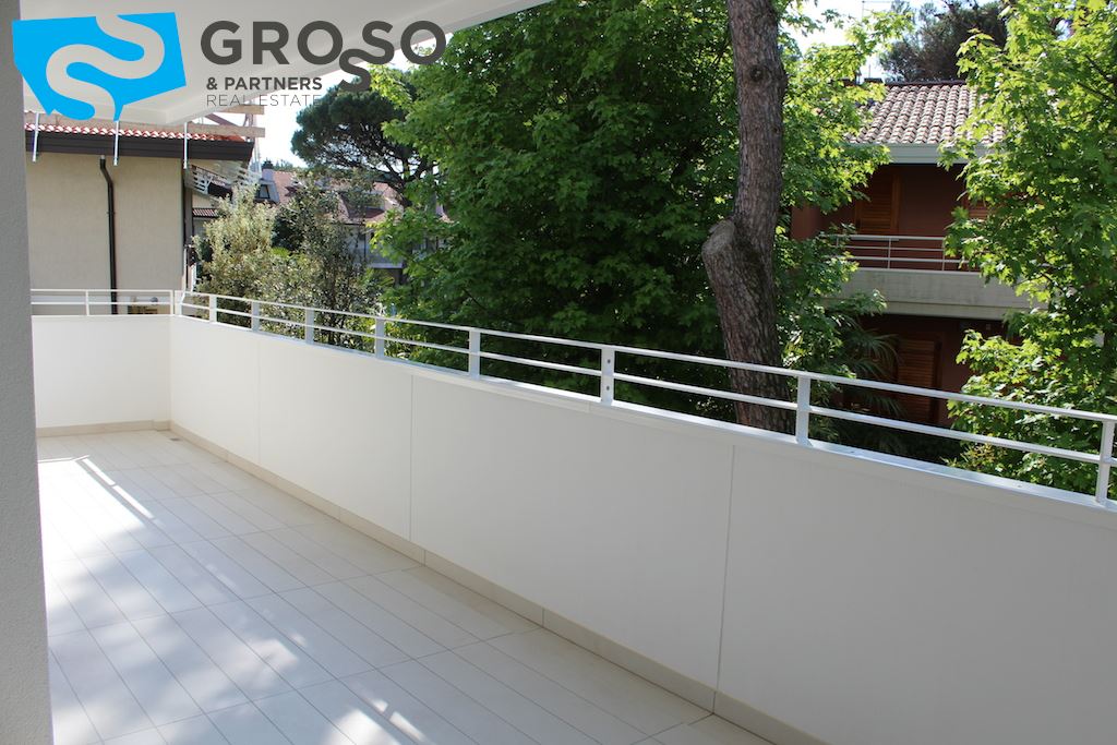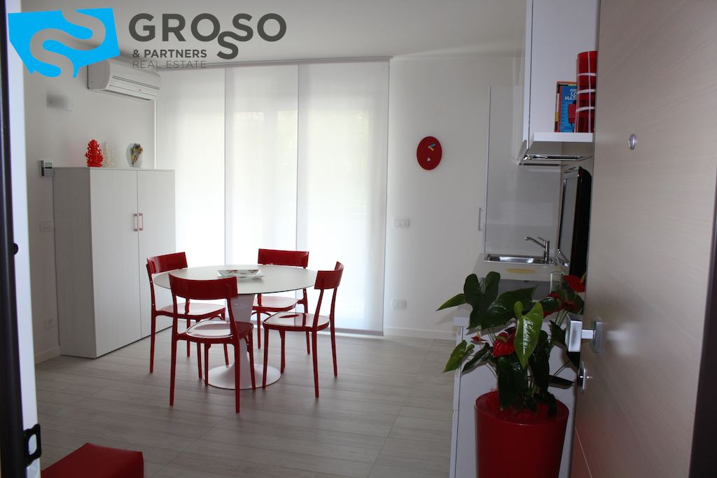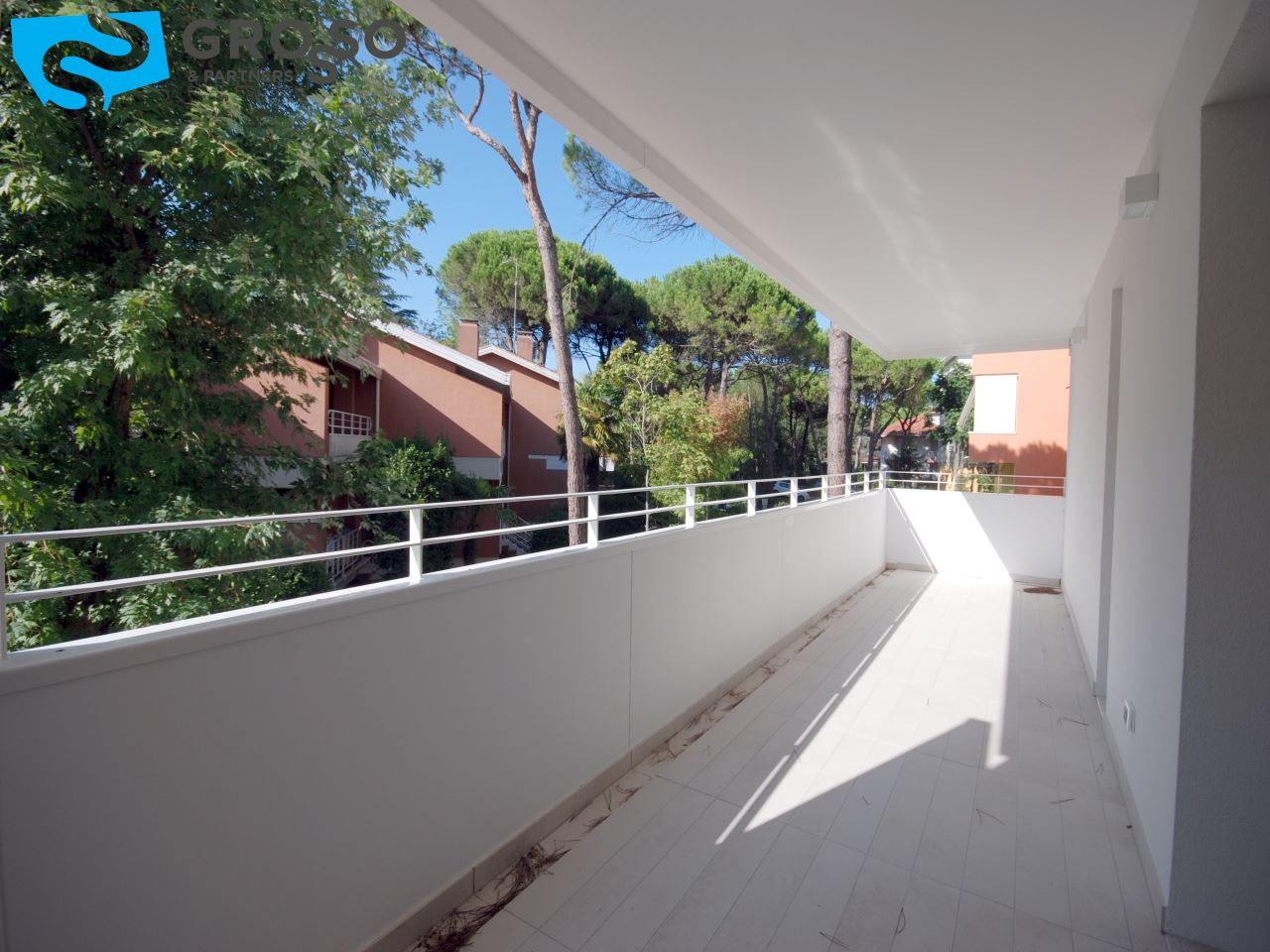 Lignano Pineta, in modernissimo contesto residenziale, disponiamo di bilocale sito al primo piano di cinque servito da ascensore. L'immobile si compone di: ingresso sul soggiorno con angolo cottura, terrazza abitabile di 20 mq con vano tecnico (lavanderia), disimpegno, camera matrimoniale, cameretta, bagno finestrato con box doccia. Posto auto esterno di proprietà. Finiture di pregio: pavimenti in essenza di rovere, porta blindata, taparelle motorizzate, serramenti in vetrocamera, videocitofono, impianto di climatizzazione con pompa di calore e radiatore scaldasalviette in bagno. Classe energetica: A, pannelli solari.