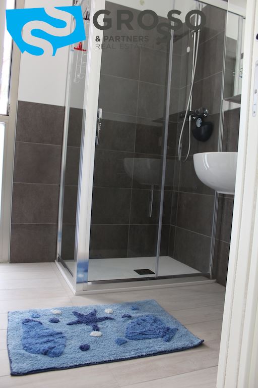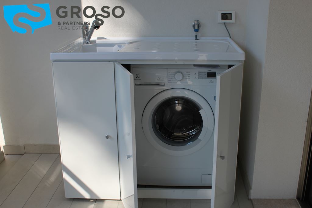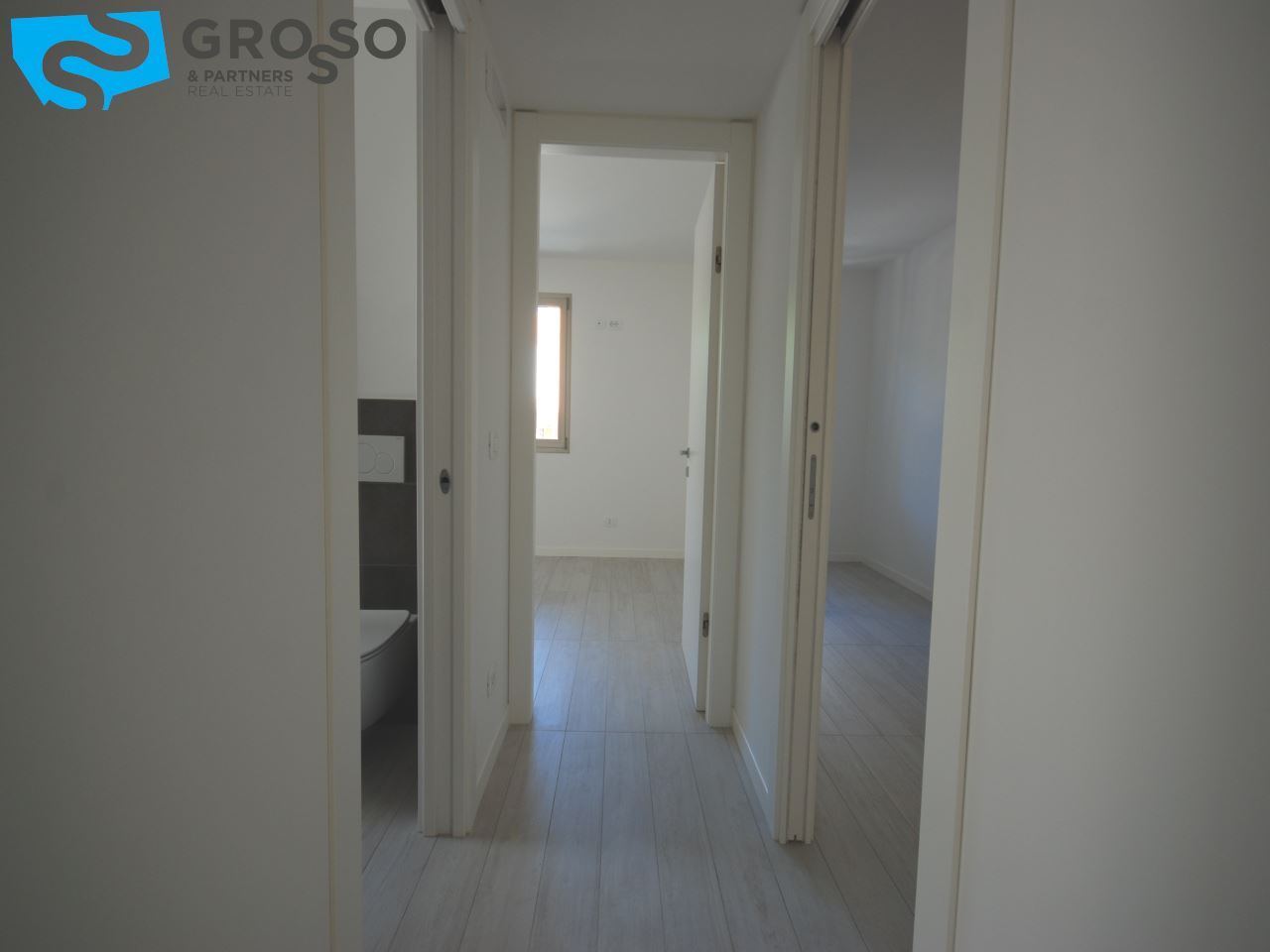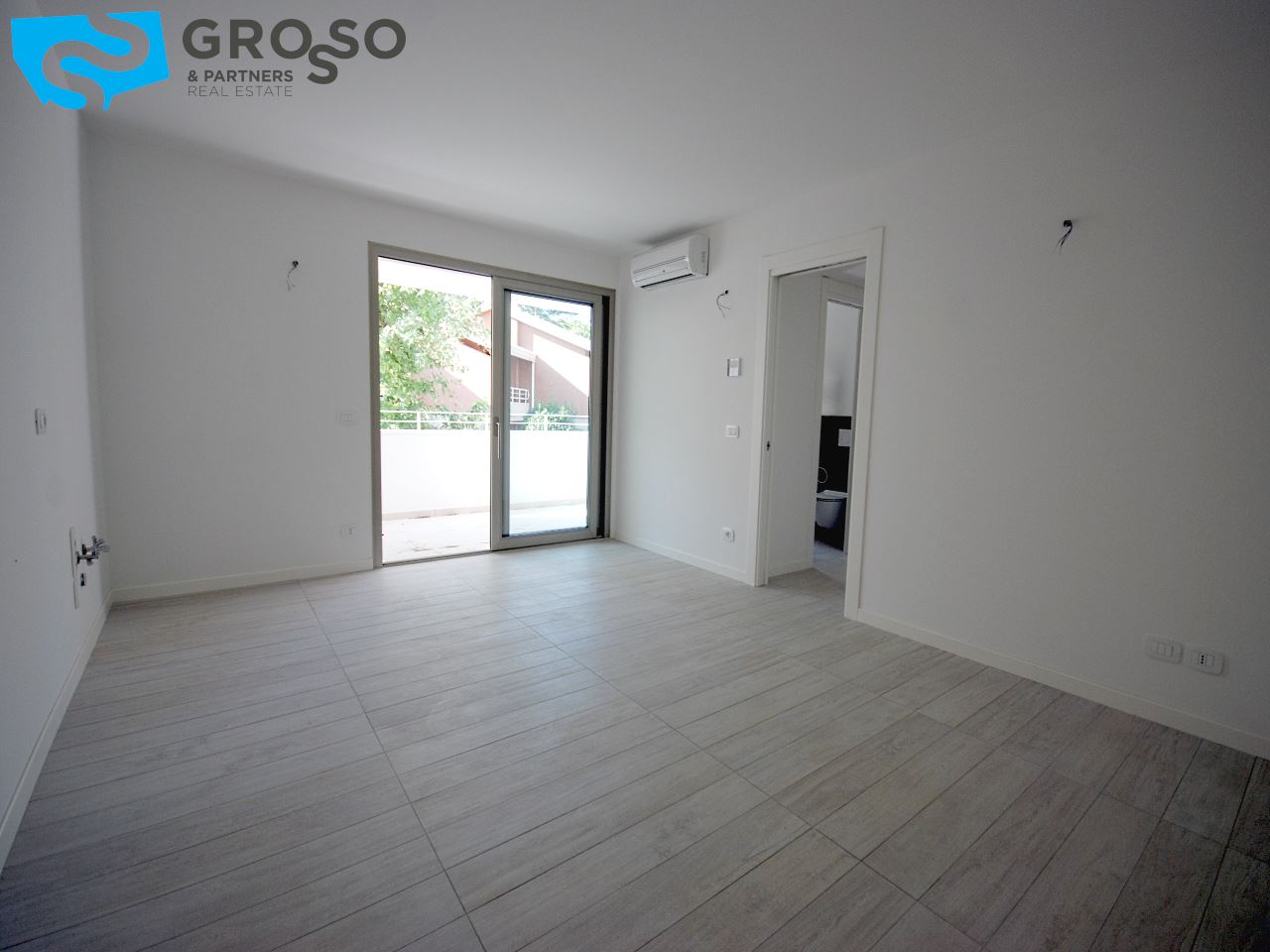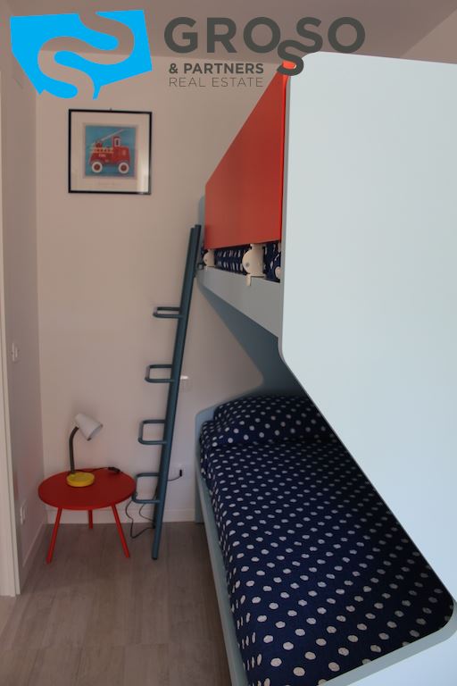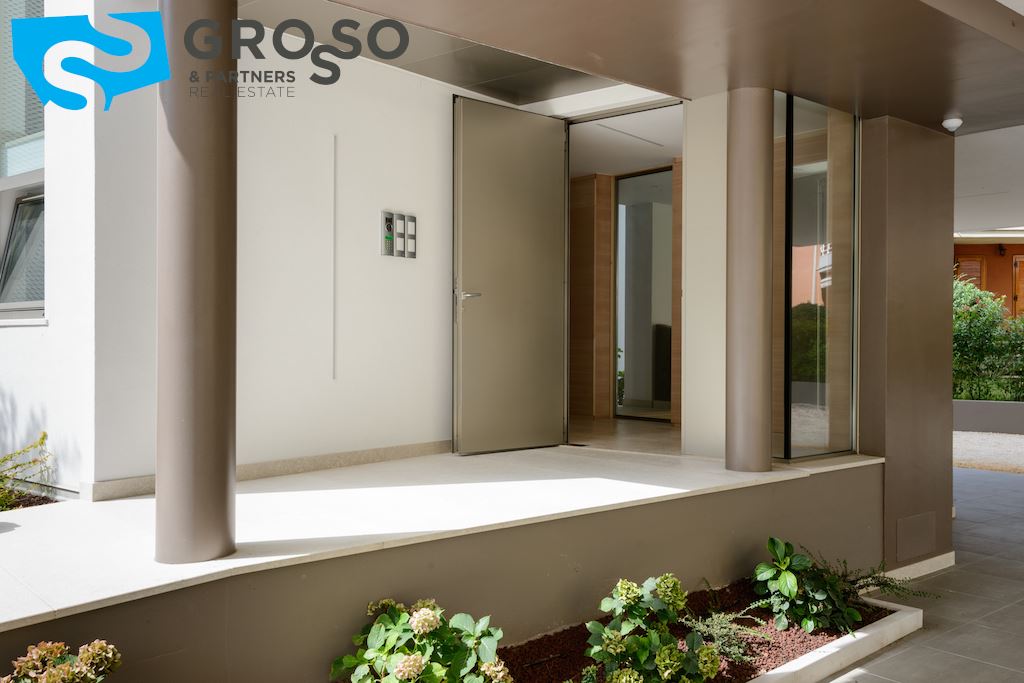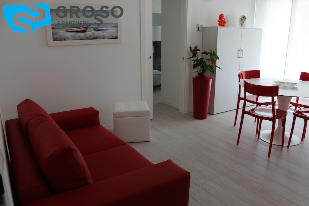 Lignano Pineta, in modernissimo contesto residenziale, disponiamo di bilocale sito al primo piano di cinque servito da ascensore. L'immobile si compone di: ingresso sul soggiorno con angolo cottura, terrazza abitabile di 20 mq con vano tecnico (lavanderia), disimpegno, camera matrimoniale, cameretta, bagno finestrato con box doccia. Posto auto esterno di proprietà. Finiture di pregio: pavimenti in essenza di rovere, porta blindata, taparelle motorizzate, serramenti in vetrocamera, videocitofono, impianto di climatizzazione con pompa di calore e radiatore scaldasalviette in bagno. Classe energetica: A, pannelli solari.