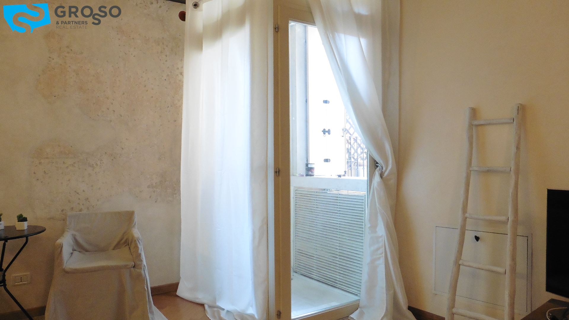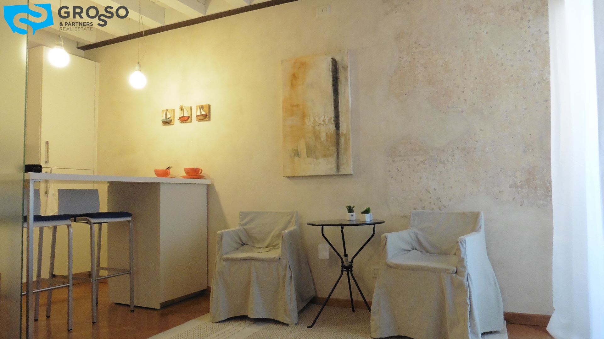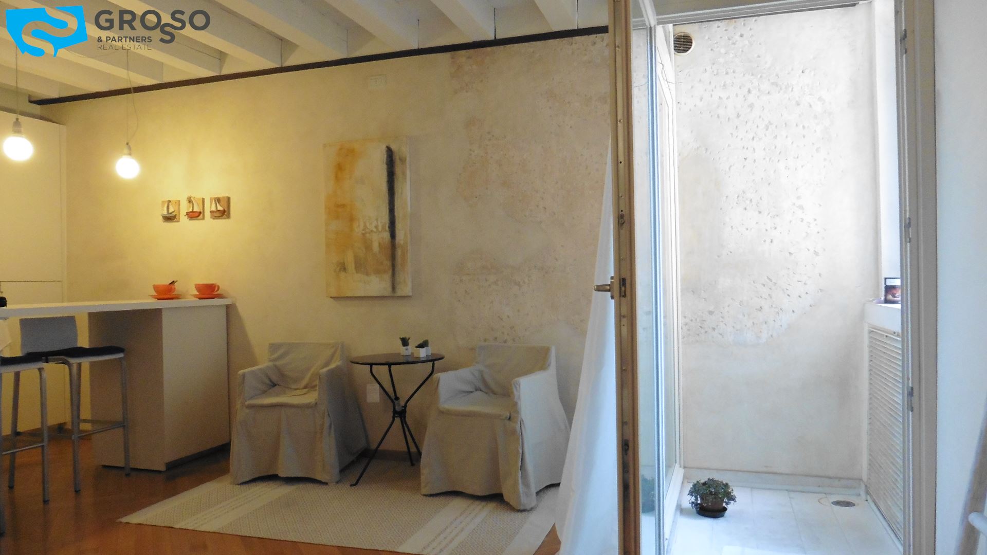 Treviso centro storico zona piazza Pola, monolocale in palazzo storico, sia il palazzo che l'appartamento sono stati oggetto di totale restauro a metà degli anni 2000, disposto al piano primo, l'appartamento viene venduto completamente arredato come da foto, è composto da un unico vano che è stato diviso in tre ambienti da delle lame di vetro acidato agganciate al soffitto, bagno separato, terrazza. Palazzo affrescato.