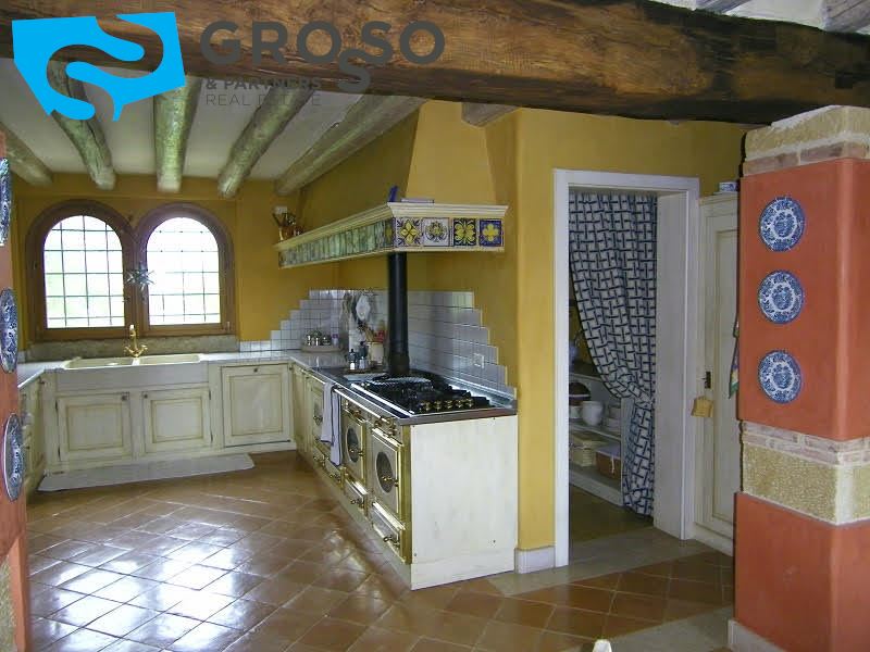 Al piano terra trova posto un ampio spazio aperto cucina soggiorno di 60 mq dotato di un grande caminetto, cucina stile campagnolo, con cucina economica a 5 fuochi di cui un barbecue con due forni elettrici ed uno a legna.