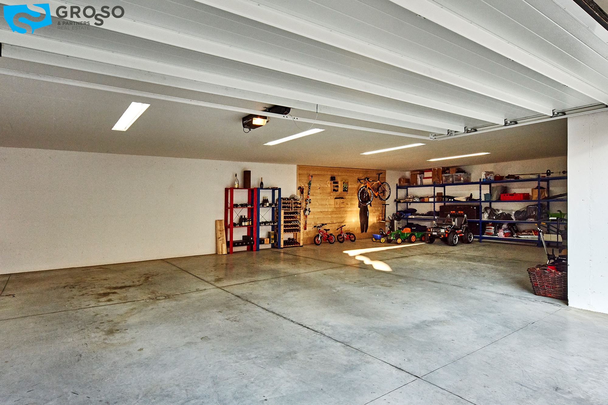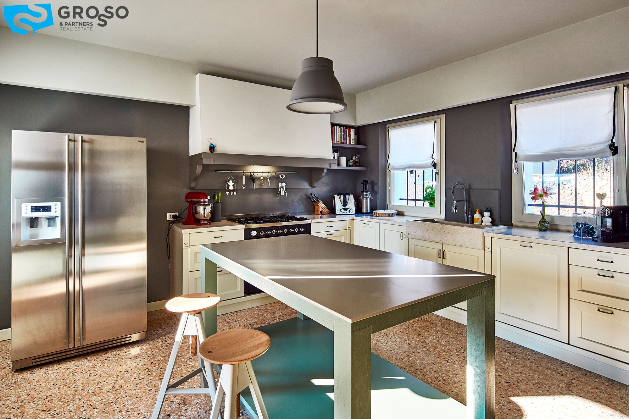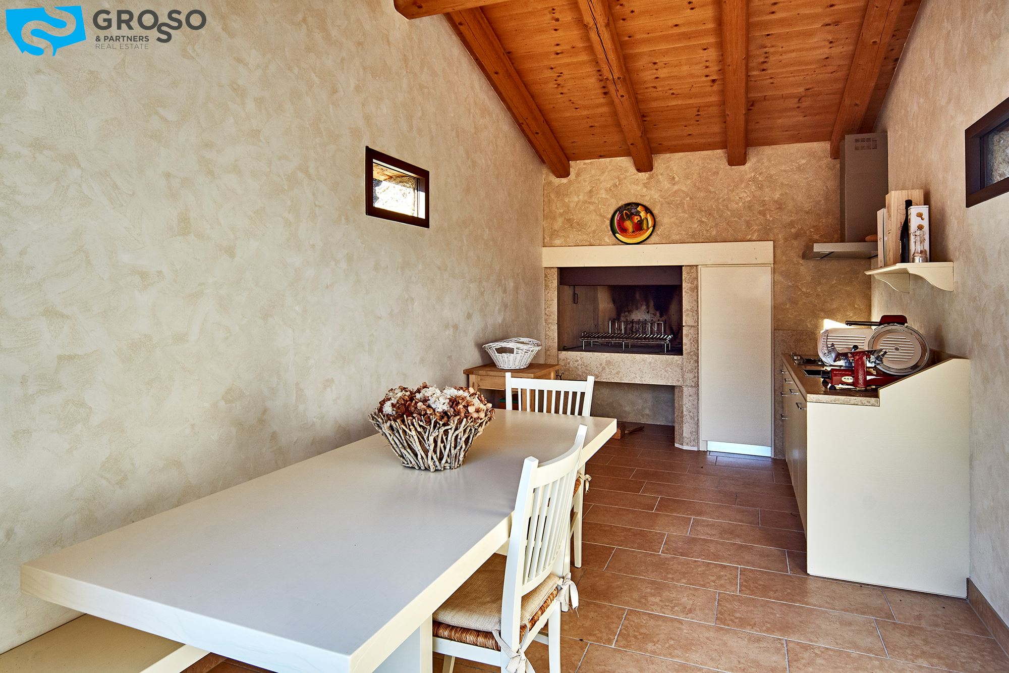 Disposta su tre livelli troviamo al piano terra un ampio salone da pranzo, cucina separata abitabile, un doppio soggiorno con camino, bagno, stanza per la donna di servizo, piano primo tre ampie camere e doppi servizi, piano interrato, enoteca, stanza pluriuso, lavanderia/stireria e bagno. Nello scoperto trova spazio un annesso adibito a stanza per le cene con camino e cucina della paiacchi. Completa la proprietà un garage di mq 100 ricavato nel terrazzamento retrostante l'abitazione.